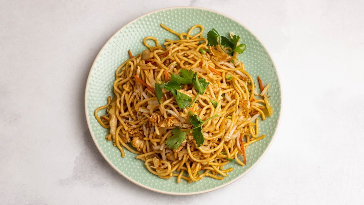 smažené rýžové nudle se zeleninou (bílá cibule, jarní cibulka, koriandr), smaženou cibulkou, vejci a chilli