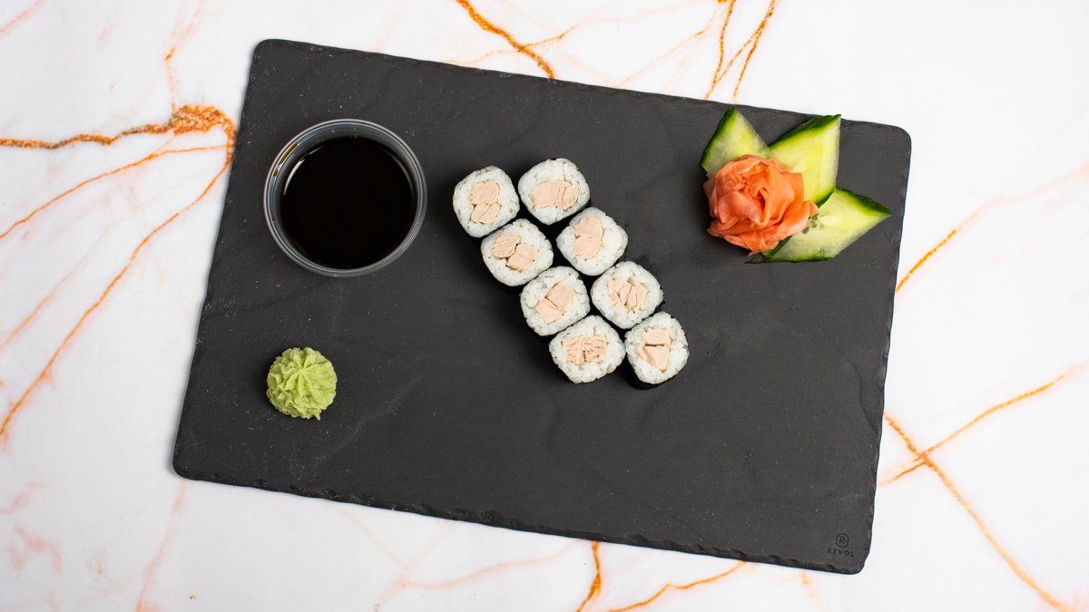 smažené sushi s krevetovou tempurou, okurkou, ředkví