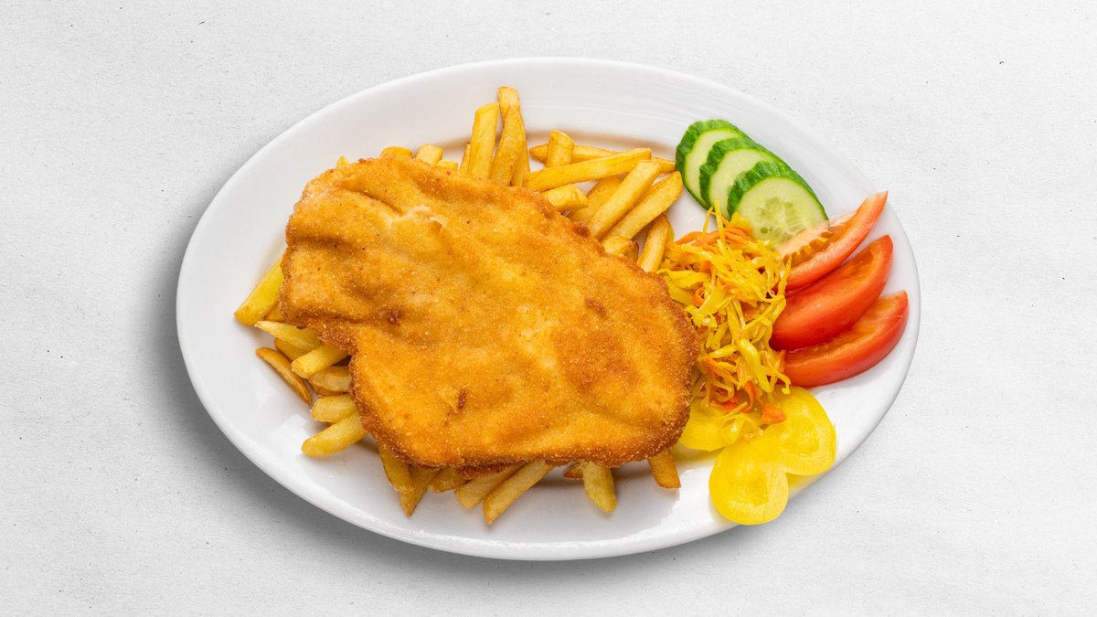 Smažený sýr, hranolky, tatarská omáčka, obloha