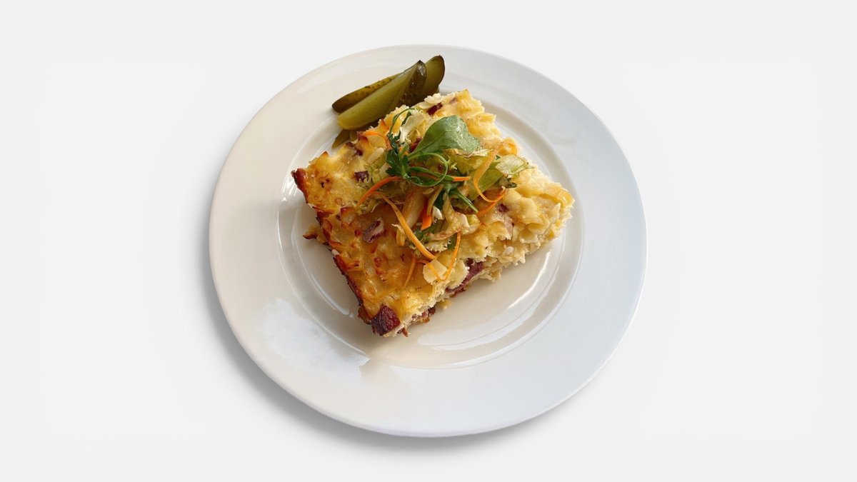 Zapékané flíčky s uzeným masem a vejci, nakládaný okurek