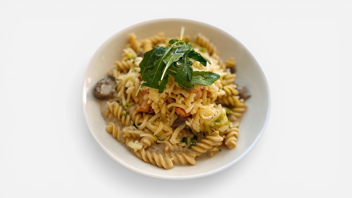 Těstoviny s kuřecím masem v hříbkovo - smetanové omáčce, sypané sýrem