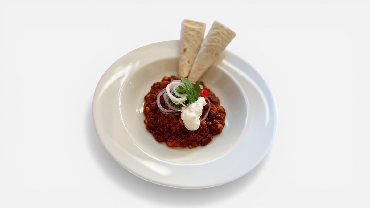 2. Mexické chilli con carne s fazolemi, zakysanou smetanou a feferonkou, rozpečená tortilla