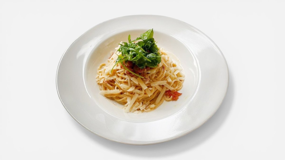 Špagety s pancettou, smetanou a žloutky, sypané sýrem Grana Padano