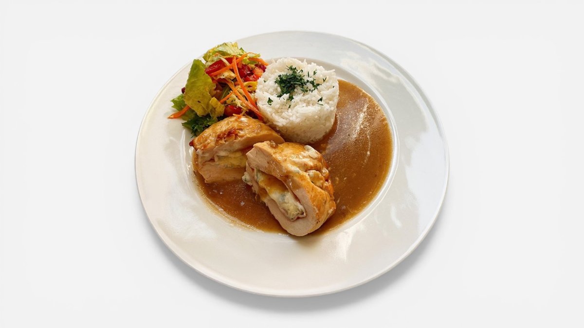 1. Kuřecí závitek se šunkou a nivou, basmati rýže, salátek