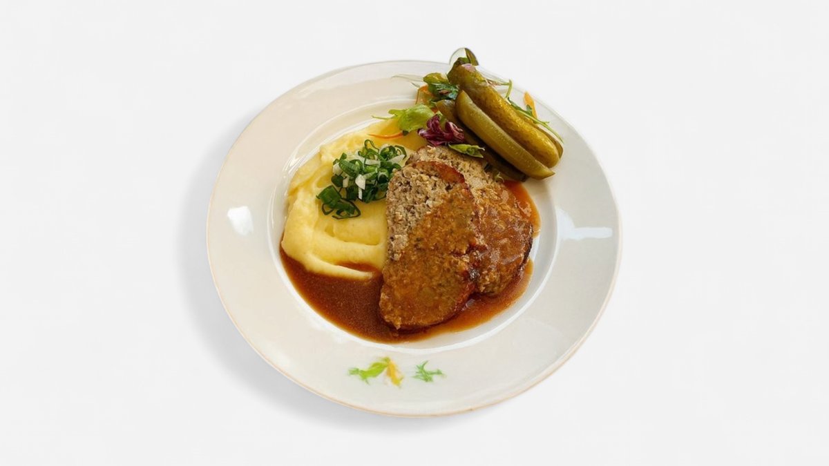 1. Domácí sekaná se slaninou, bramborová kaše, zelný salát s křenem
