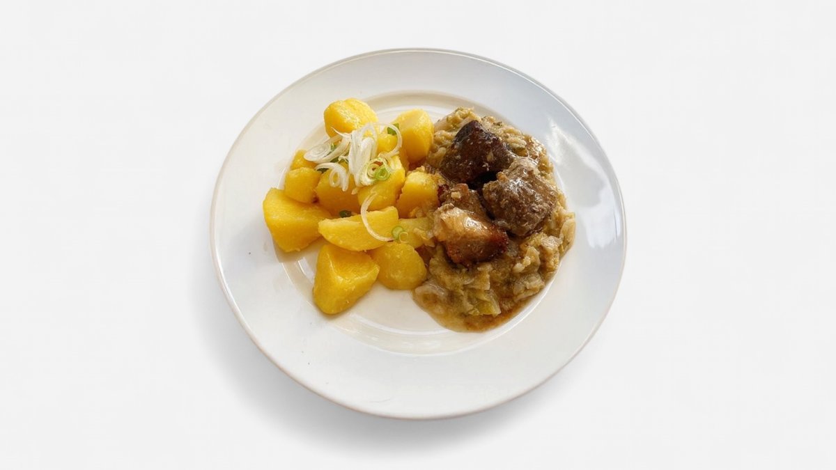 2. Pečený vepřový vrabec, dušená kapusta, vařené brambory