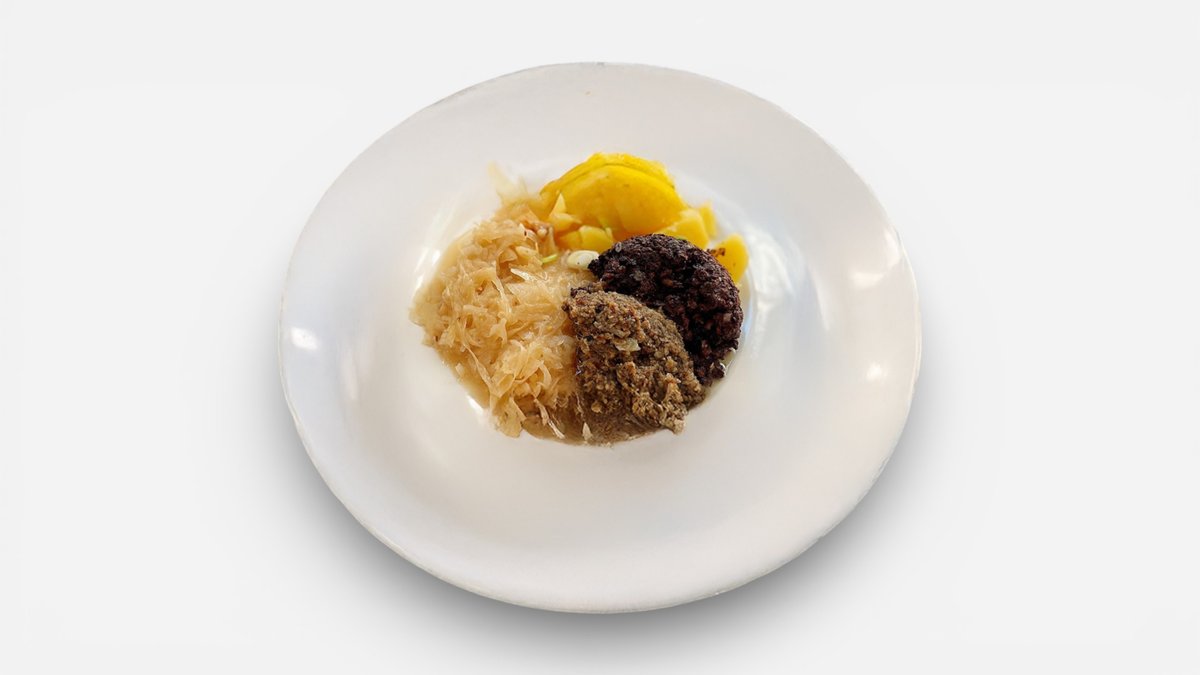 2. Pečený prejt (jelítkový, jitrnicový), dušené bílé zelí, vařené brambory