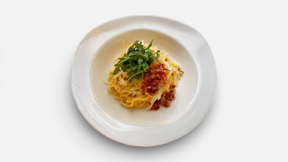 3. Špagety s pancettou, žloutky a smetanou, sypané sýrem Grana Padano