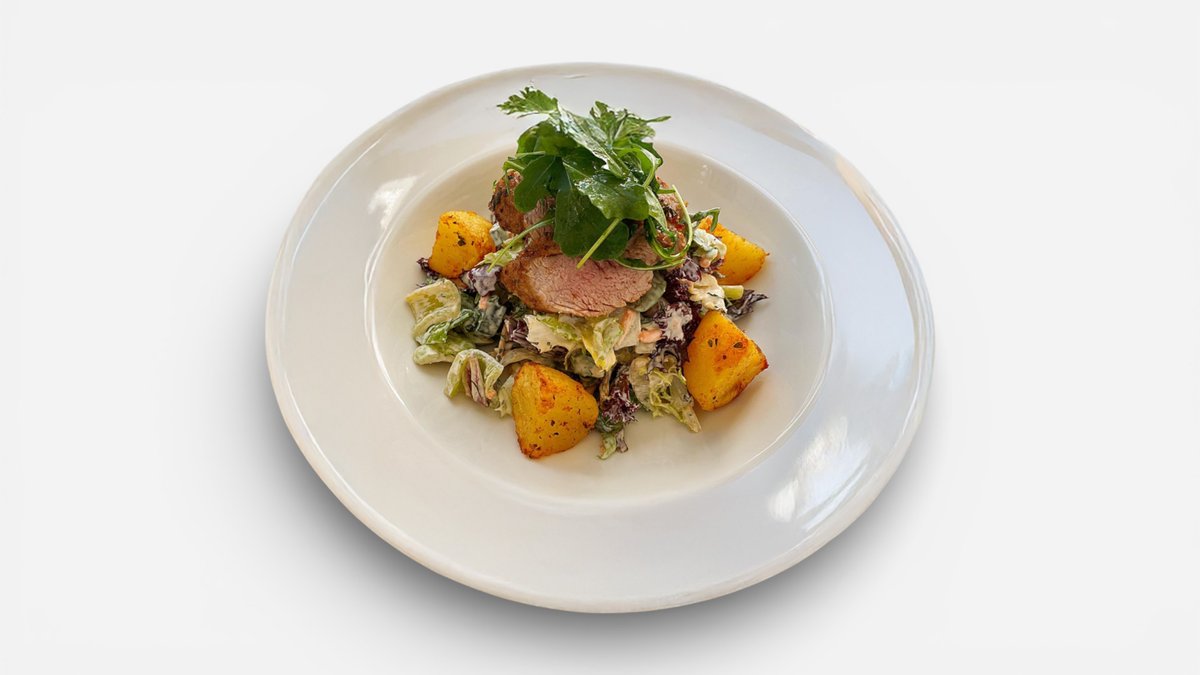 Míchaný zeleninový salát s česnekovým dresinkem, filírovanou vepřovou panenkou a pečeným bramborem