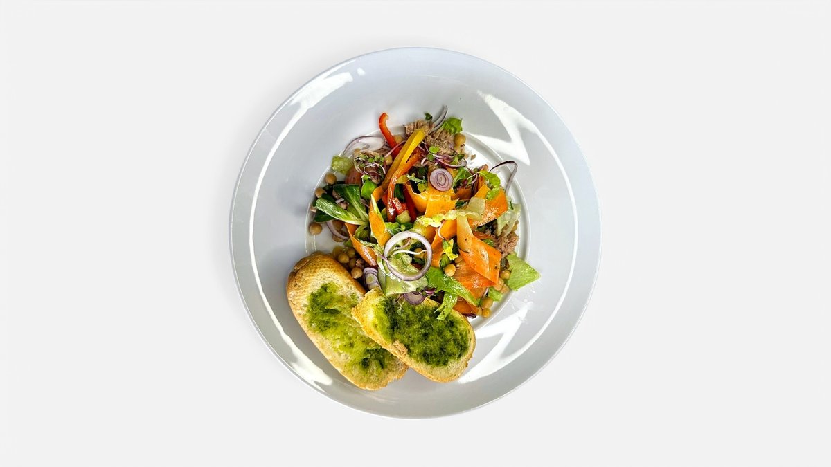 Cizrnový salát s tuňákem, pečená bagetka