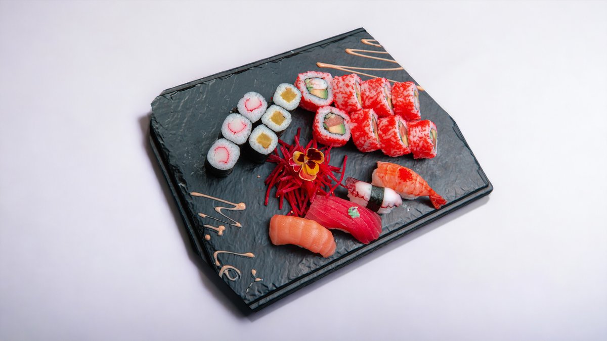 12ks Mix maki (losos, tuňák, okurka, nakládaná ředkev), 4ks California special (vařená kreveta, kaviár, avokádo, okurka)