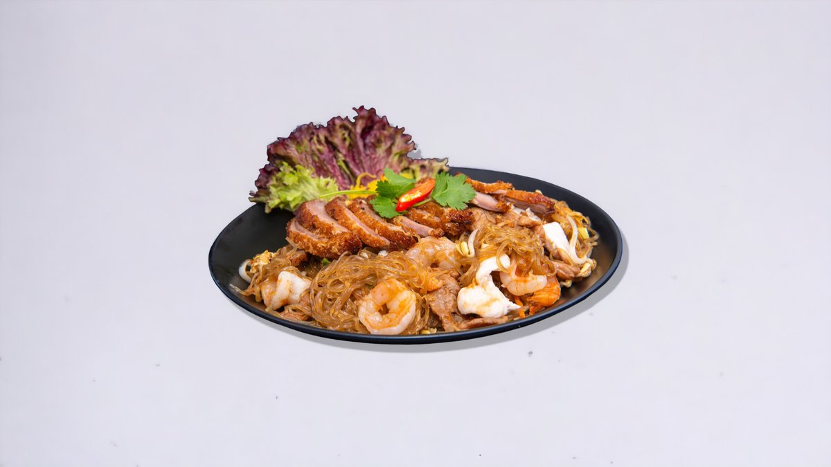 restované skleněné nudle, kuřecí maso, krevety, krabí klepeta, kachna a hovězí maso