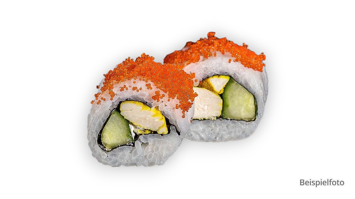 with cucumbers, cream cheese, flambéed salmon fillet, spring onions, fish roe and sesame in a size of your choice Contains alcohol, not suitable for children and pregnant women