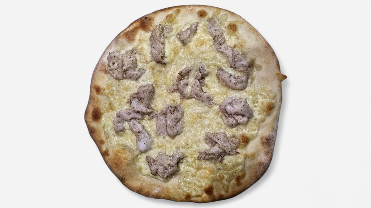 crispy pizza dough topped with juicy chicken, fresh onions, and melt-in-your-mouth Gouda cheese on an aromatic tomato sauce