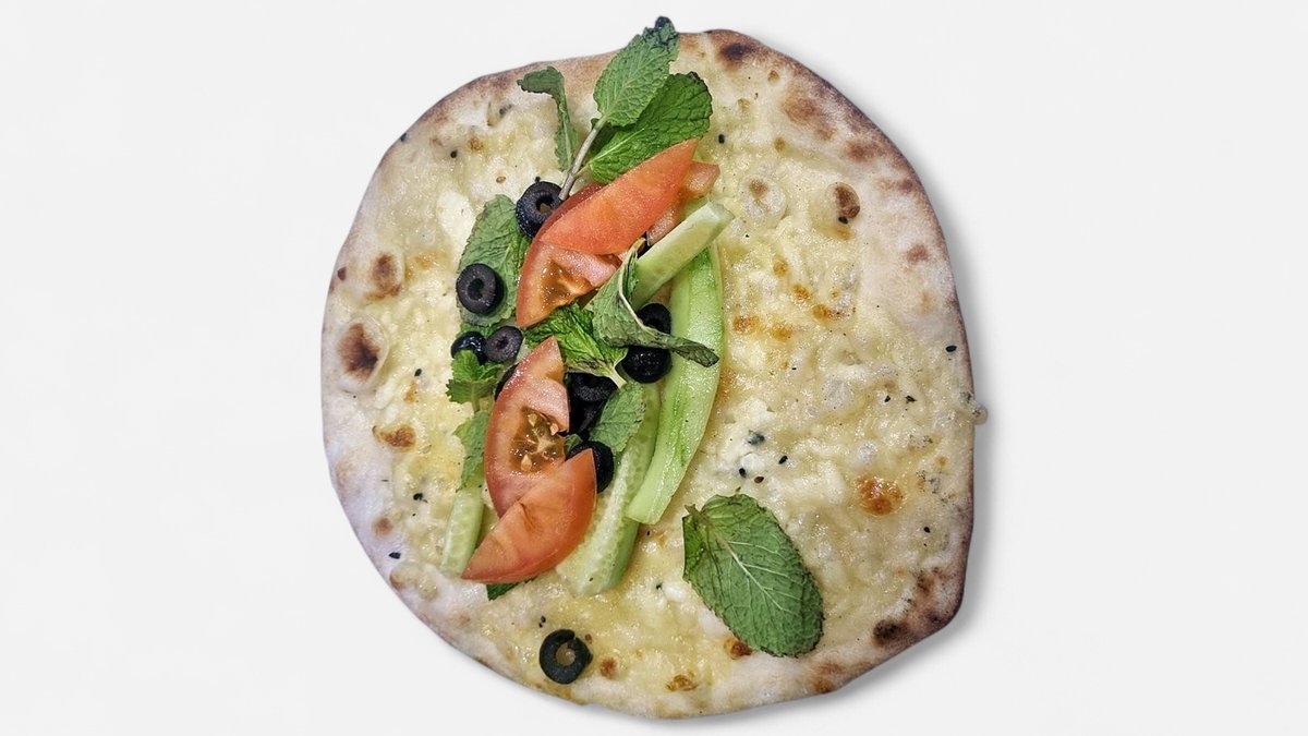 with zatar, prepared on soft dough with a crispy edge, topped with aromatic thyme and olive oil, with fresh tomatoes, cucumbers, black olives and mint leaves