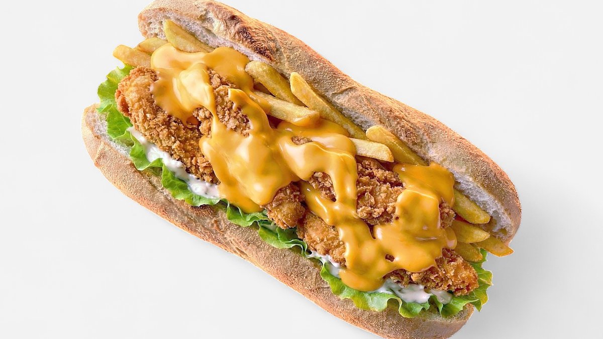 mit frittierten Hähnchenstücken auf einem weichen Brötchen, dazu Schmelzkäse, Tomaten, Salat und MO-Soße