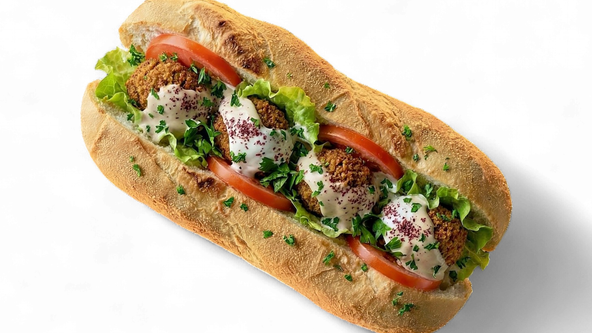 mit einem herzhaften Falafelpatty auf einem weichen Brötchen mit Salat, Tomaten und Soße