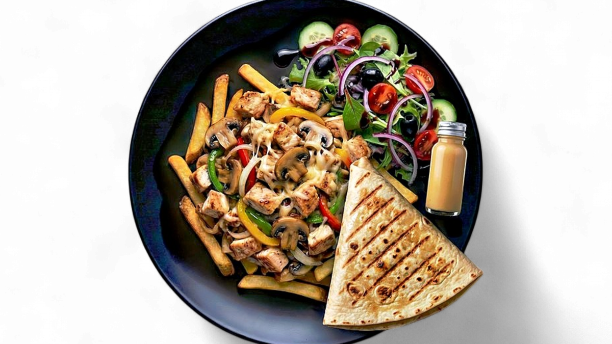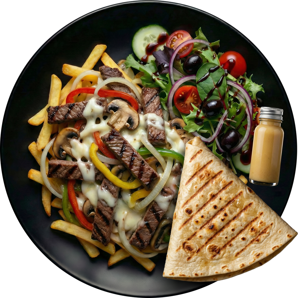 gegrillte Rumpsteakstreifen mit Paprika, Champignons und Zwiebeln, garniert mit Eisbergsalat, Gouda und hausgemachter Knoblauch-MO-SoĂźe