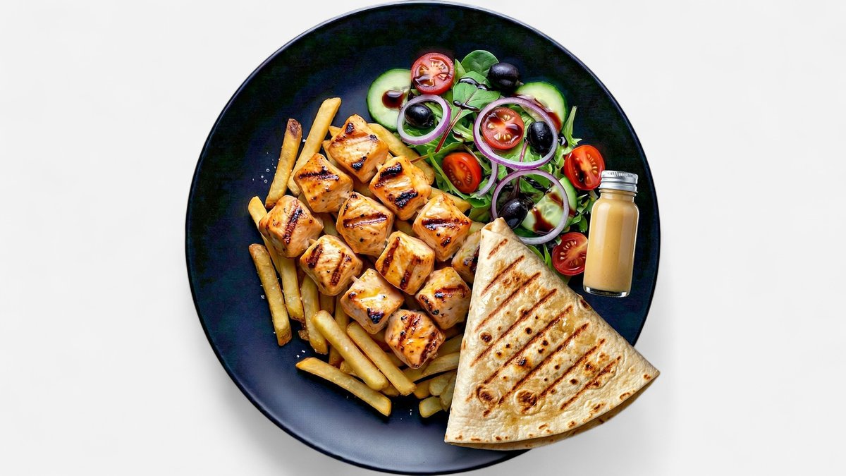 mit marinierter Hähnchenbrust, gegrillt mit Paprika, Pilzen, Zwiebeln garniert mit Eisbergsalat, Pommes frites, Gouda und hausgemachter Knoblauch-MO-Soße