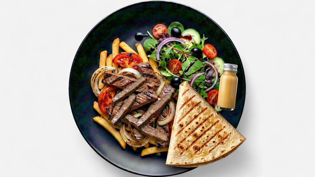 gegrillte Rumpsteakstreifen mit Tomaten und Zwiebeln, garniert mit Pommes frites, Eisbergsalat, Petersilie und SesamsoĂźe