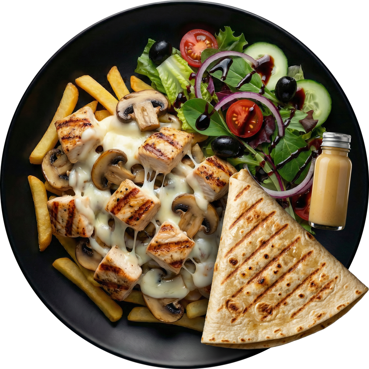 mit marinierter Hähnchenbrust, gegrillt mit Champignons, garniert mit Pommes frites, Eisbergsalat, Gouda und hausgemachter Knoblauch-MO-Soße