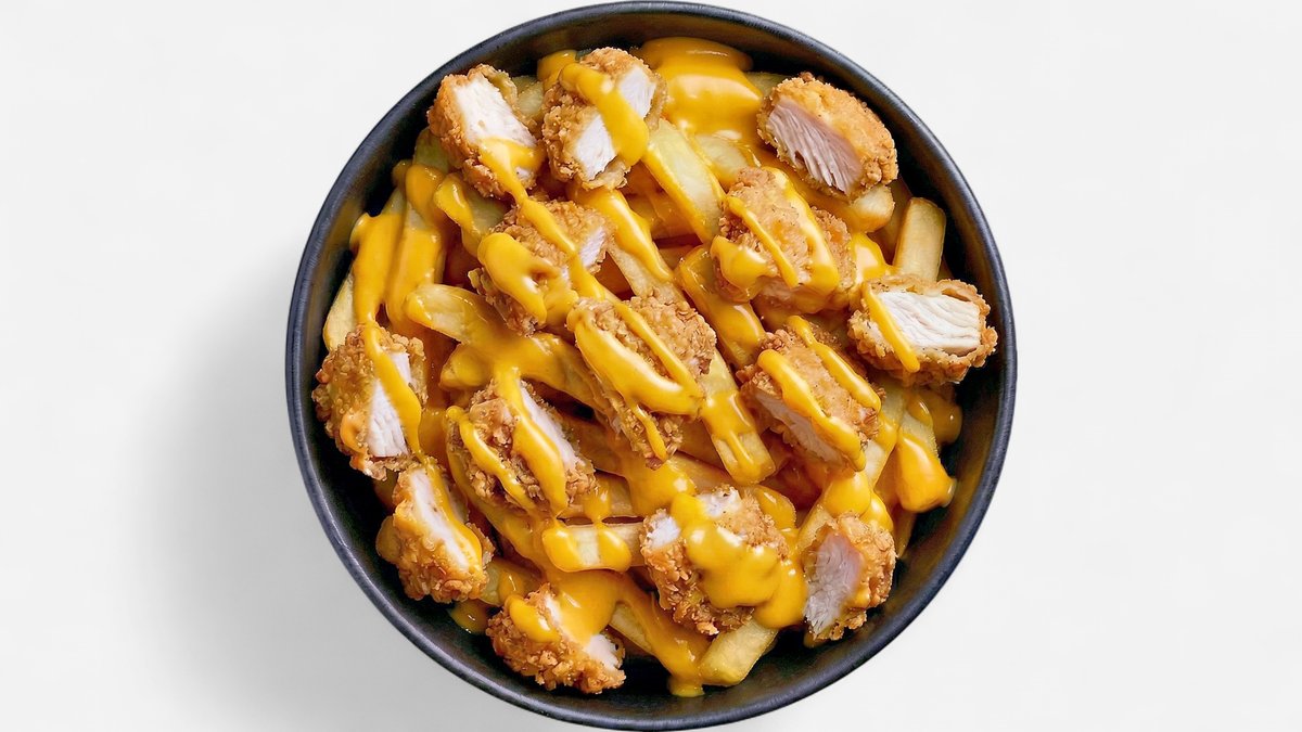 mit frittierten Hähnchenstücken, garniert mit Pommes frites, Eisbergsalat, Cheddar und hausgemachter Knoblauch-MO-Soße