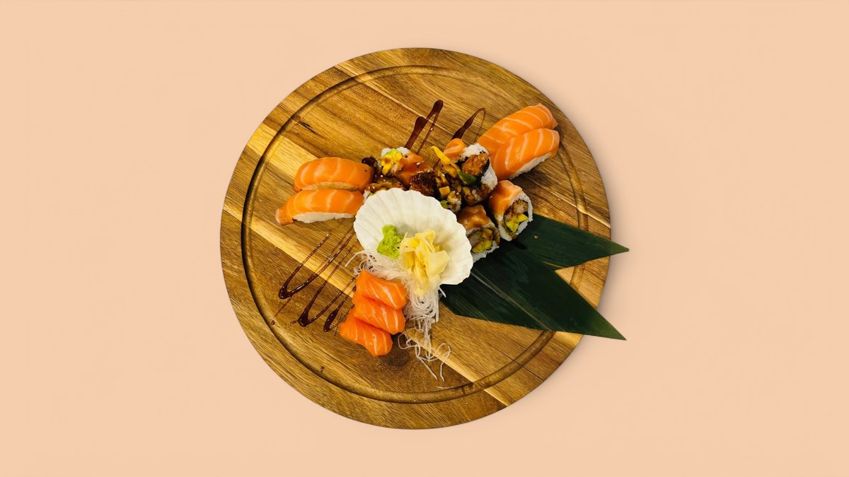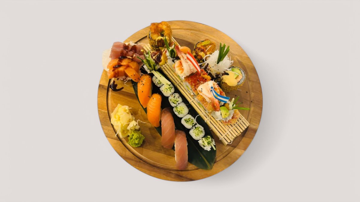 für 2 Personen, 10x Lachs Tempura Roll, 8x Kreative Rolls, 8x Gurken Maki, 4x Lachs Nigiri, 4x Thunfisch Nigiri, 4x Lachs Sashimi, 4x Thunfisch Sashimi