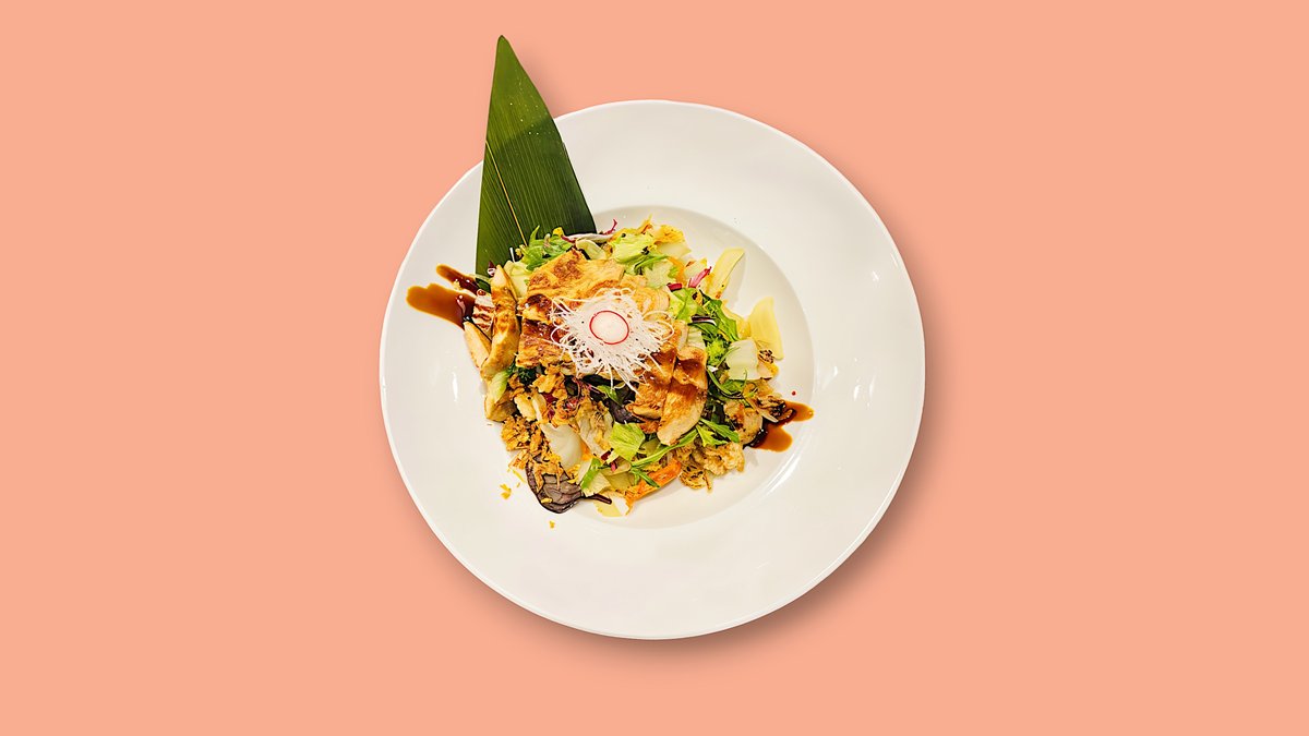 gebratener Reis mit frischem Gemüse, Pak Choi, gerösteten Zwiebeln und einer Zutat deiner Wahl, garniert mit Salat