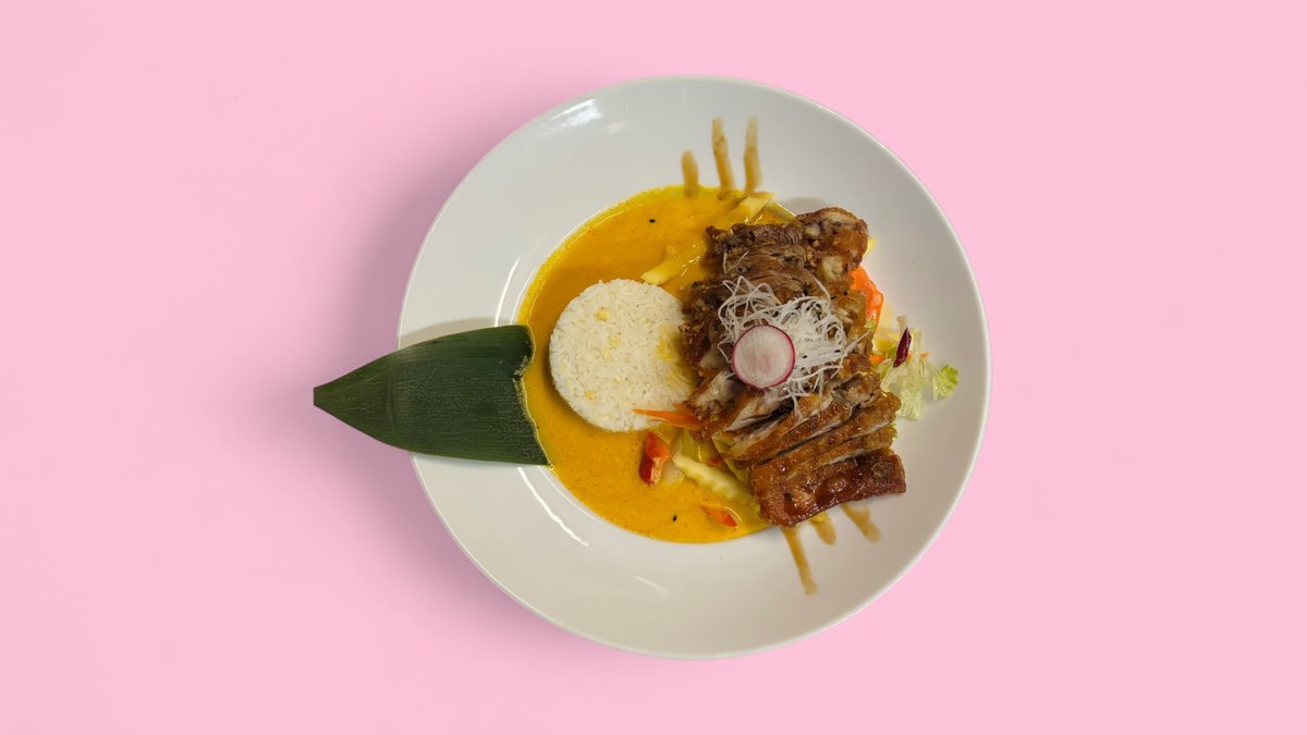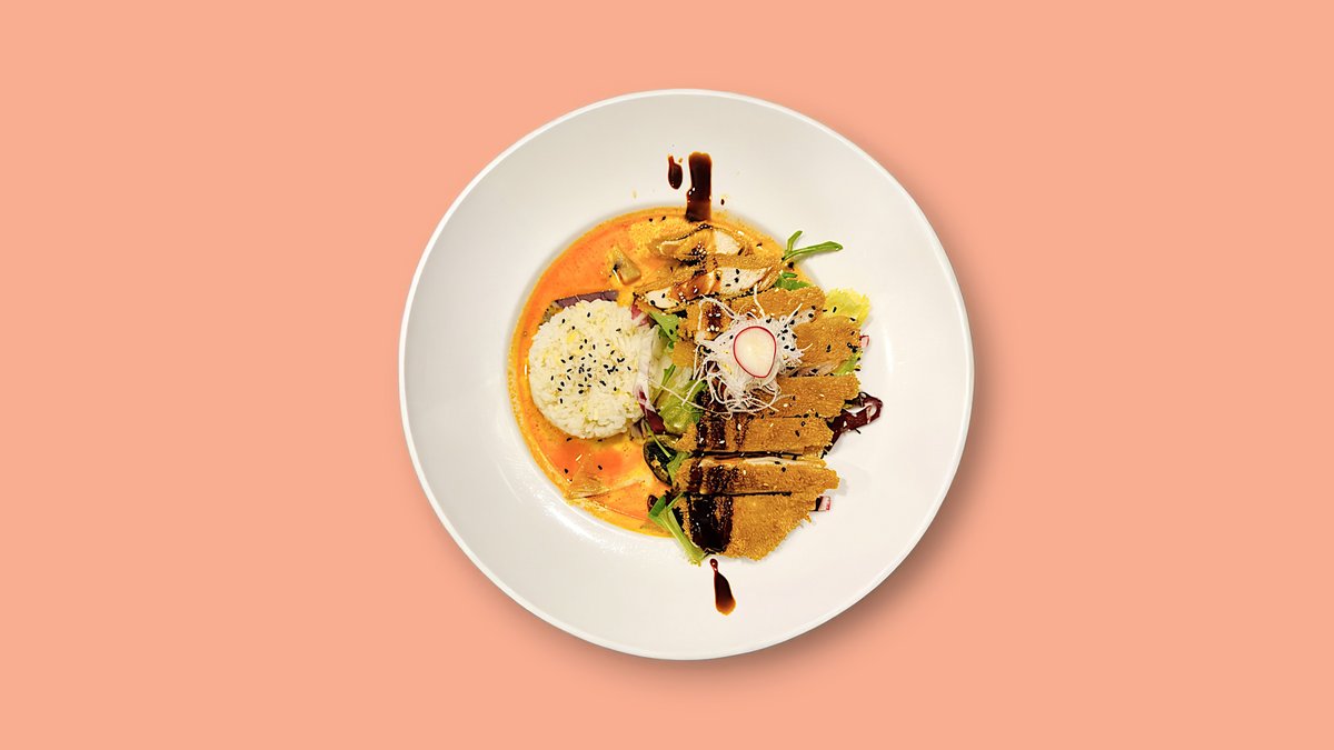 im sonnigen Kokosnusssoße, frischem Gemüse und einer Zutat deiner Wahl, dazu Duftreis, serviert mit Salat