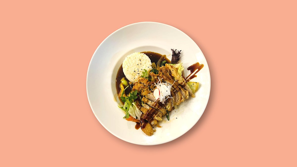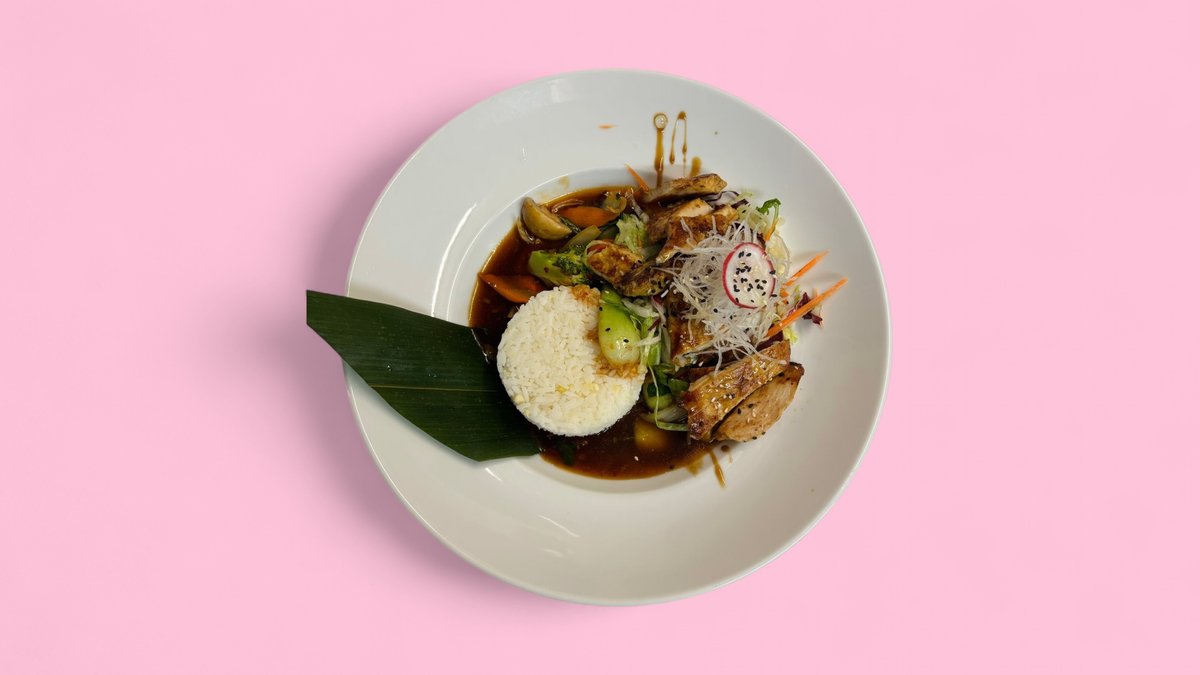 hausgemachte Teriyaki-Soße mit frischem Gemüse und einer Zutat deiner Wahl, dazu Duftreis verfeinert mit Salat.
