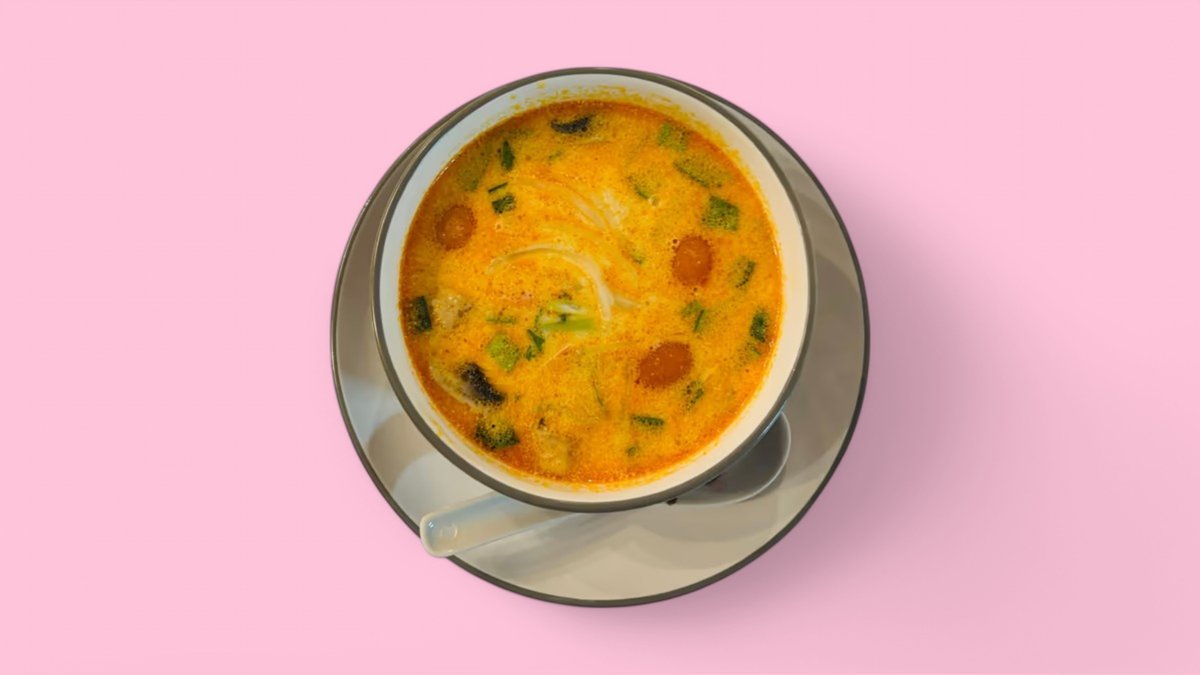 kräftige Hühnerbrühe mit Champignons, Kirschtomaten, Zucchini, Brokkoli, Sahne nach Geschmack, einer Zutat deiner Wahl, verfeinert mit Frühlingszwiebeln und Koriander