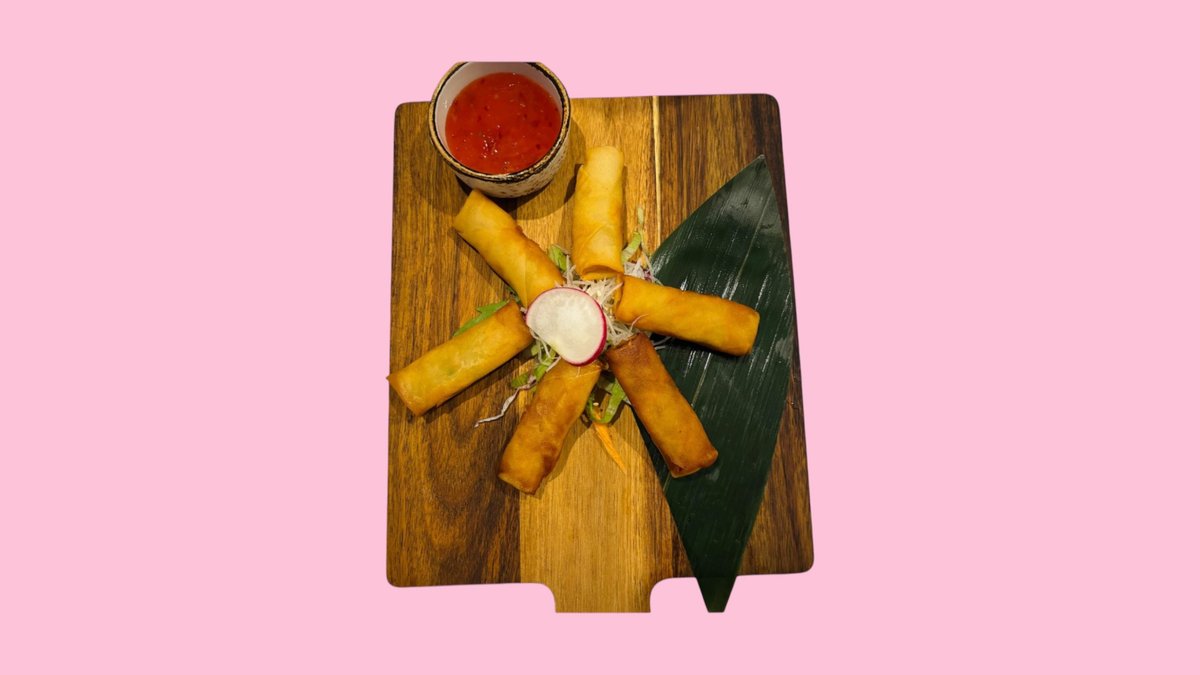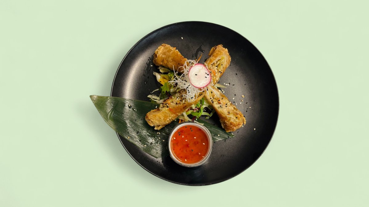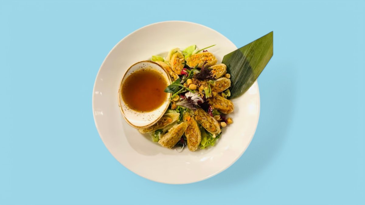 gebackene Rollen mit Gemüsefüllung, dazu Salat, süße Chilisauce