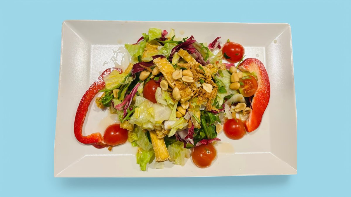 mit knackigem Salat, Rucola, Radicchio, Eisbergsalat, Kirschtomaten, Paprika, Olivenöl, gerösteten Erdnüssen, Sesam, Zwiebeln, einer Zutat deiner Wahl und mit hausgemachtem Limetten-Dressing verfeinert