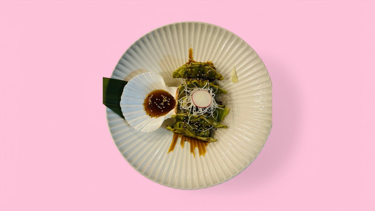 gegrillte japanische Teigtaschen mit Gemüsefüllung, serviert mit Salat und Sojasauce