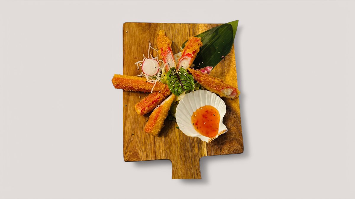Krebsfleischersatz im Tempuramantel, serviert mit Salat und süßer Chilisoße