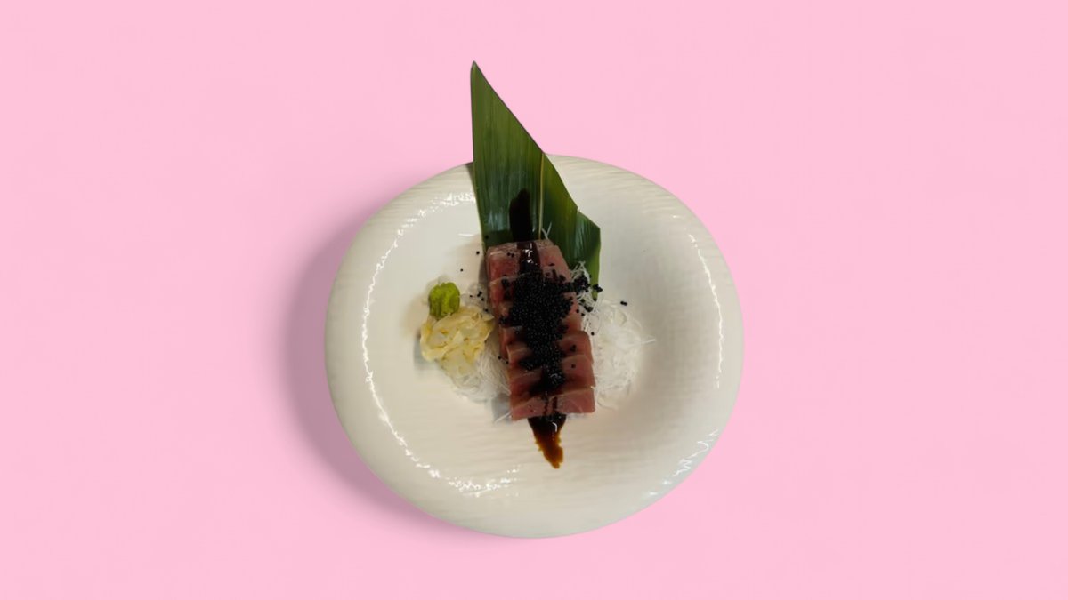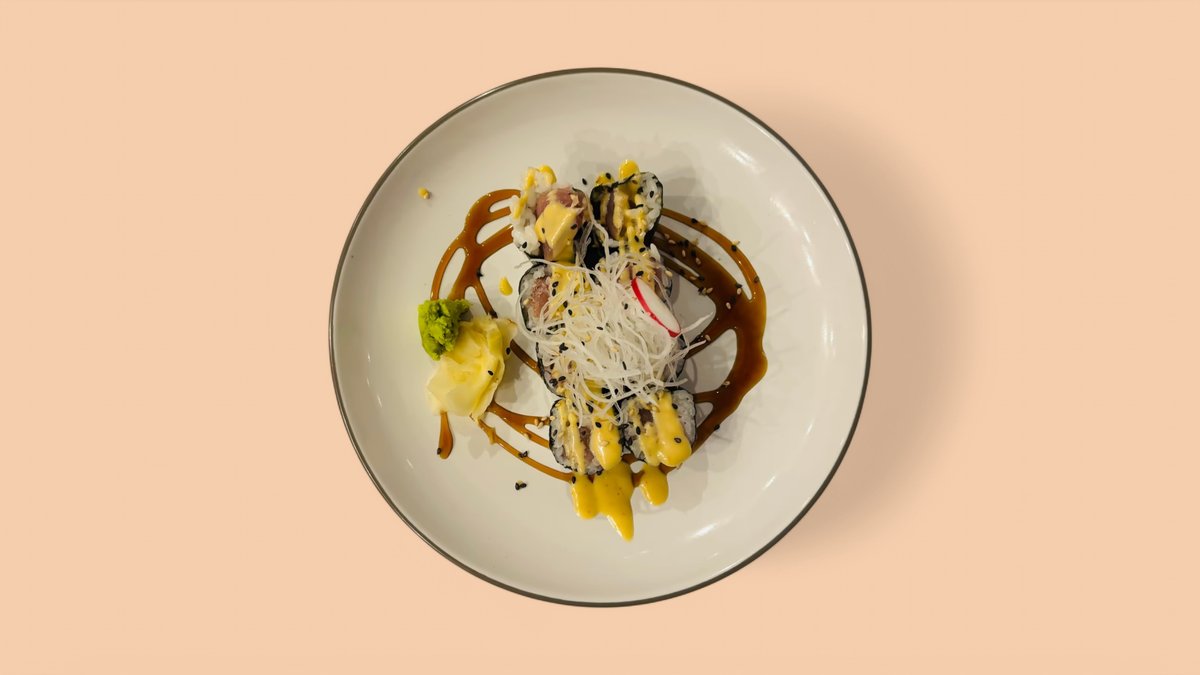 mit gebackener Krebsfleischersatz, Mango, Frischkäse und Feuer-Thunfisch
