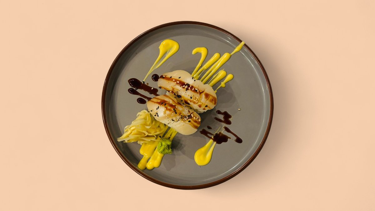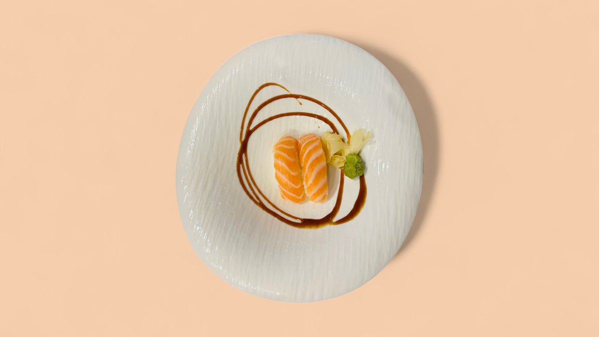 je 2 Stück serviert, und bei alle Nigiri wird der Reis und darauf liegende Fisch mit der Hand zu einer kleinen, zwei Finger breiten Rolle gedruckt