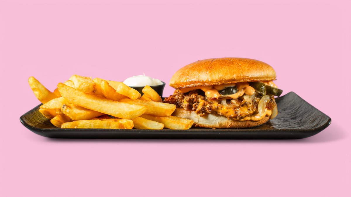 with minced beef, Cheddar cheese, braised onions, burger sauce and pickled cucumbers