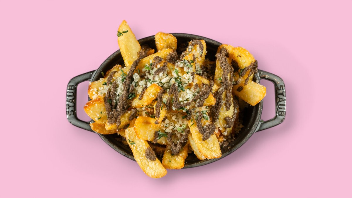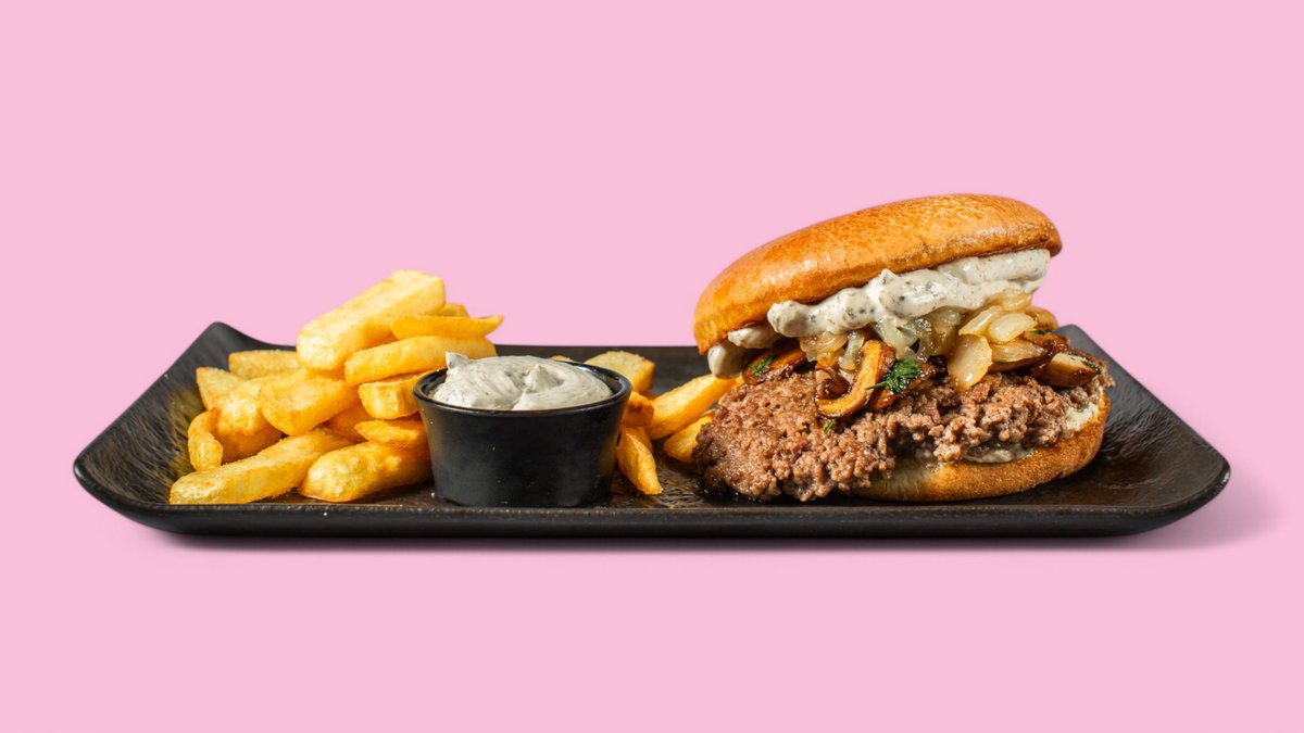 with smashed beef patty, fried mushrooms, truffle mayonnaise and braised onions