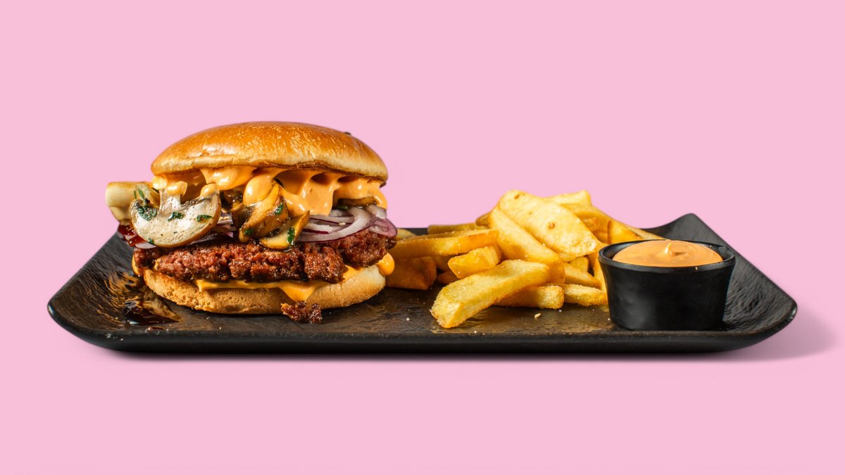with veggie minced patty, fried mushrooms, teriyaki chili mayonnaise, red onions and sesame