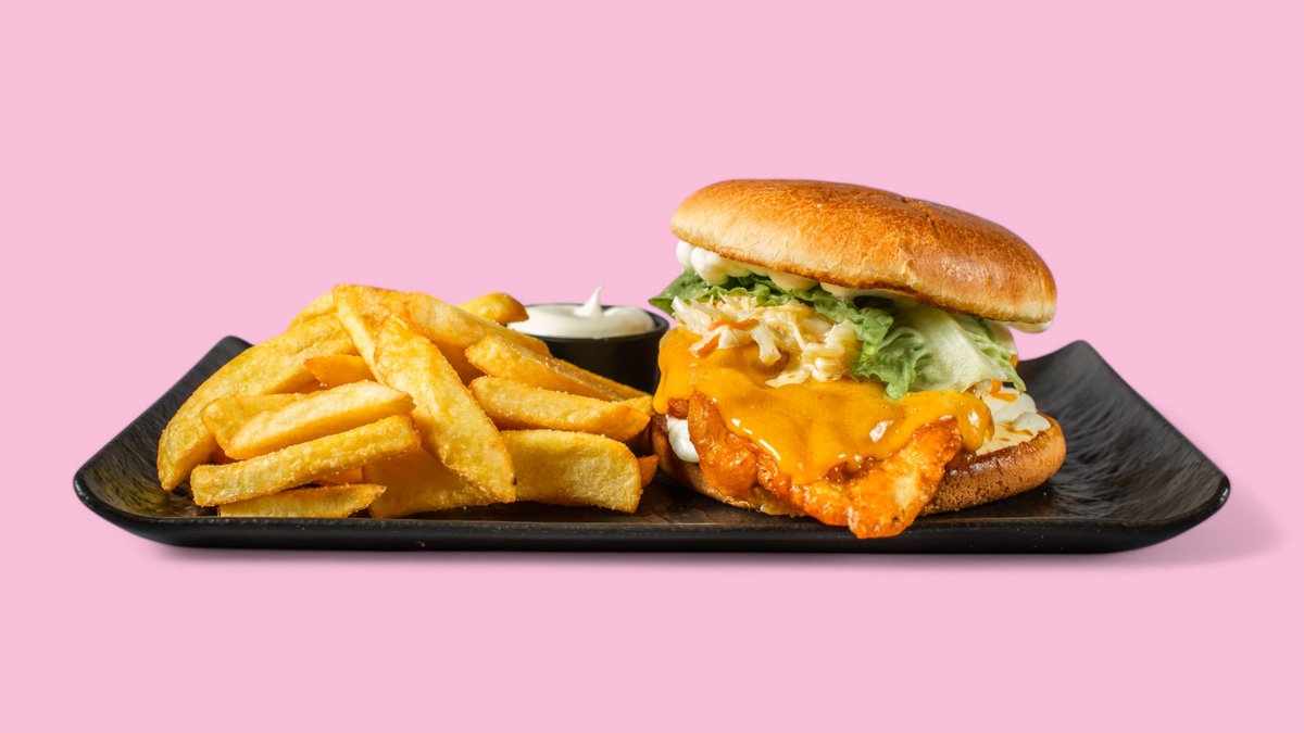 with crispy chicken fillet in batter, coleslaw, Cheddar cheese, Romaine lettuce and aioli
