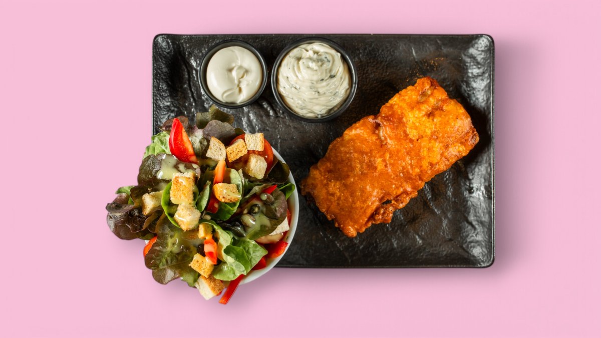 cod fillet in beer batter with Eatery's remoulade and mixed side salad with vinaigrette Contains alcohol, not suitable for children and pregnant women