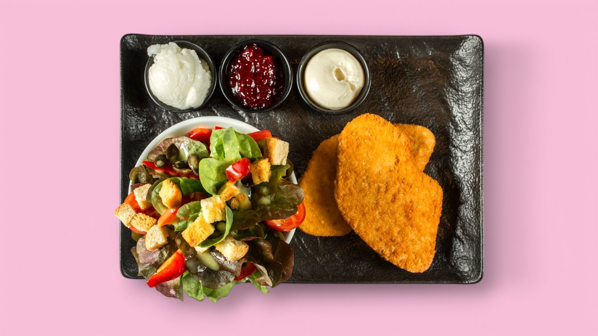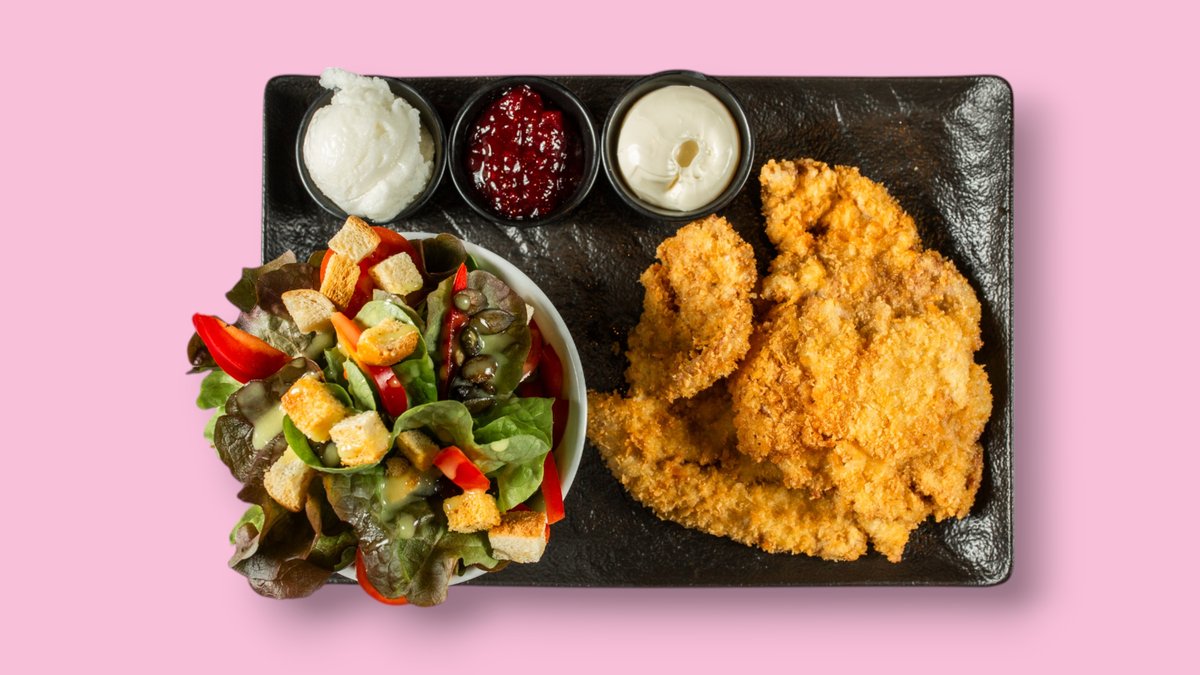 with panko breading, mayonnaise, cranberries, lemons and mixed side salad with vinaigrette