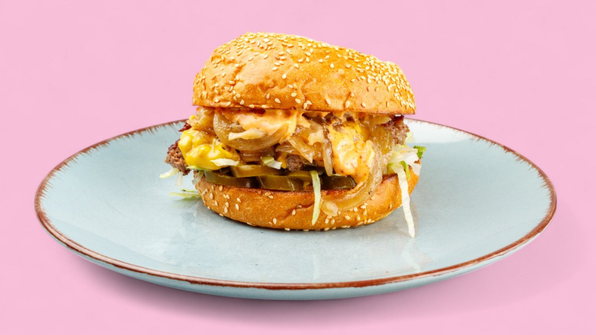 mit geschmorten Zwiebeln und Burgersoße