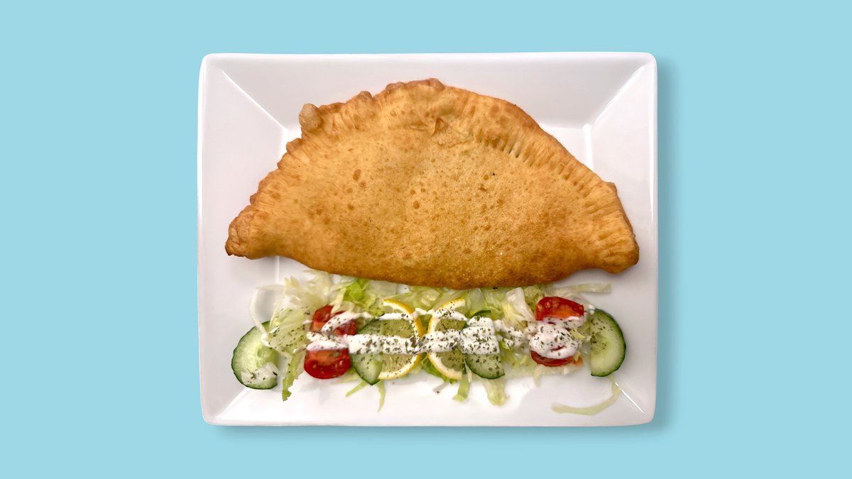 hausgemachte große Teigtasche gefüllt mit Kartoffelpüree, Lauch und Chakni