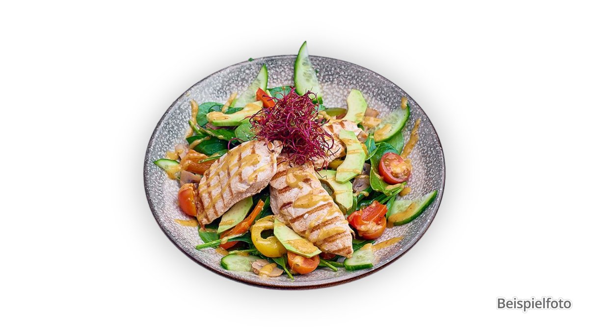 mit buntem Salat-Mix, Tomaten, Rucola, Zwibeln, Paprika, Gurken, Mais und Hähnchenstreifen