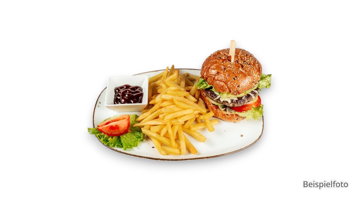 1x Burger deiner Wahl (100 g) 1x Pommes frites 1x alkoholfreies Getränk 0,33 l deiner Wahl