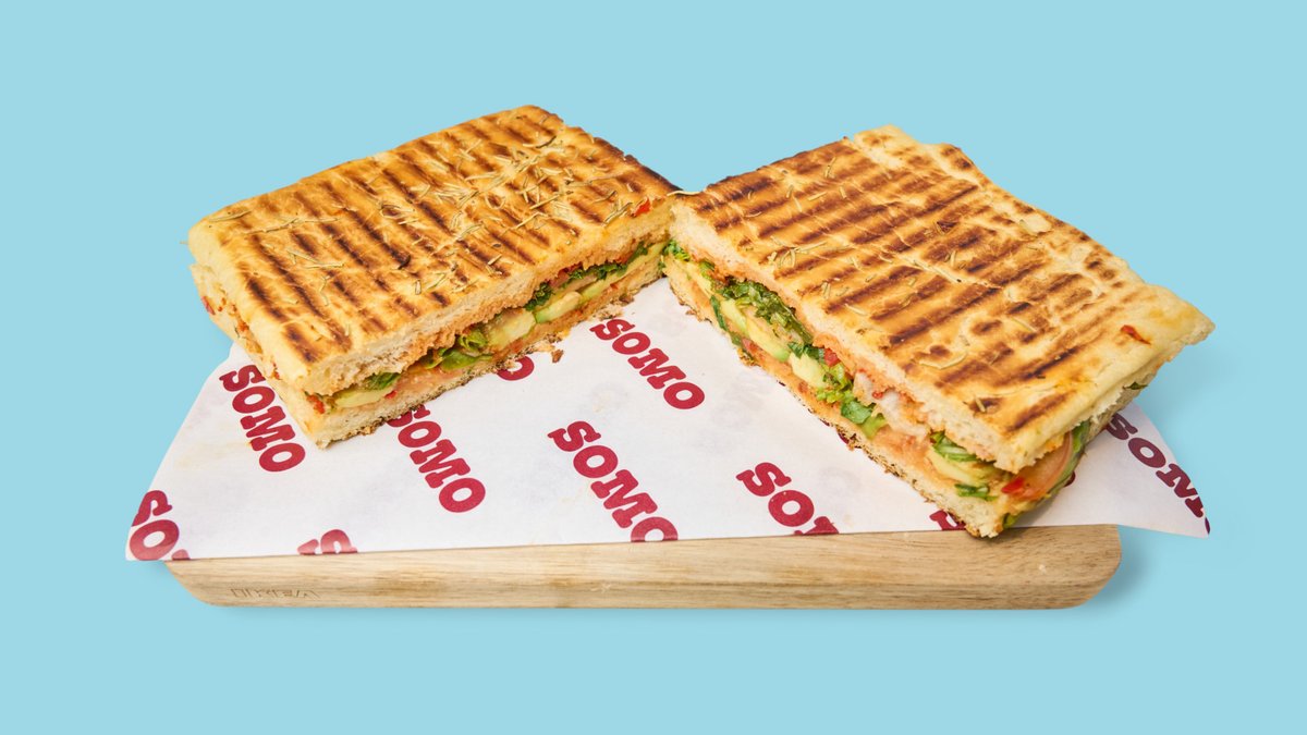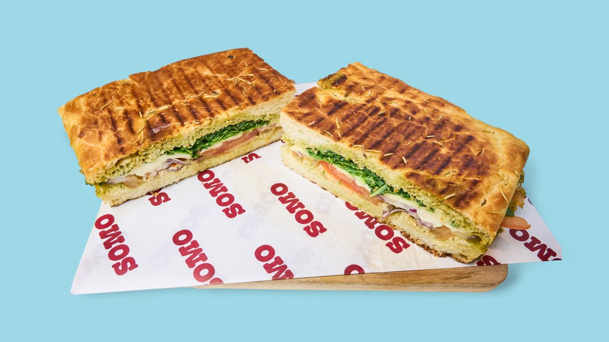 with grilled vegetables, mozzarella, rocket, pesto rosso, and bell pepper puree spread