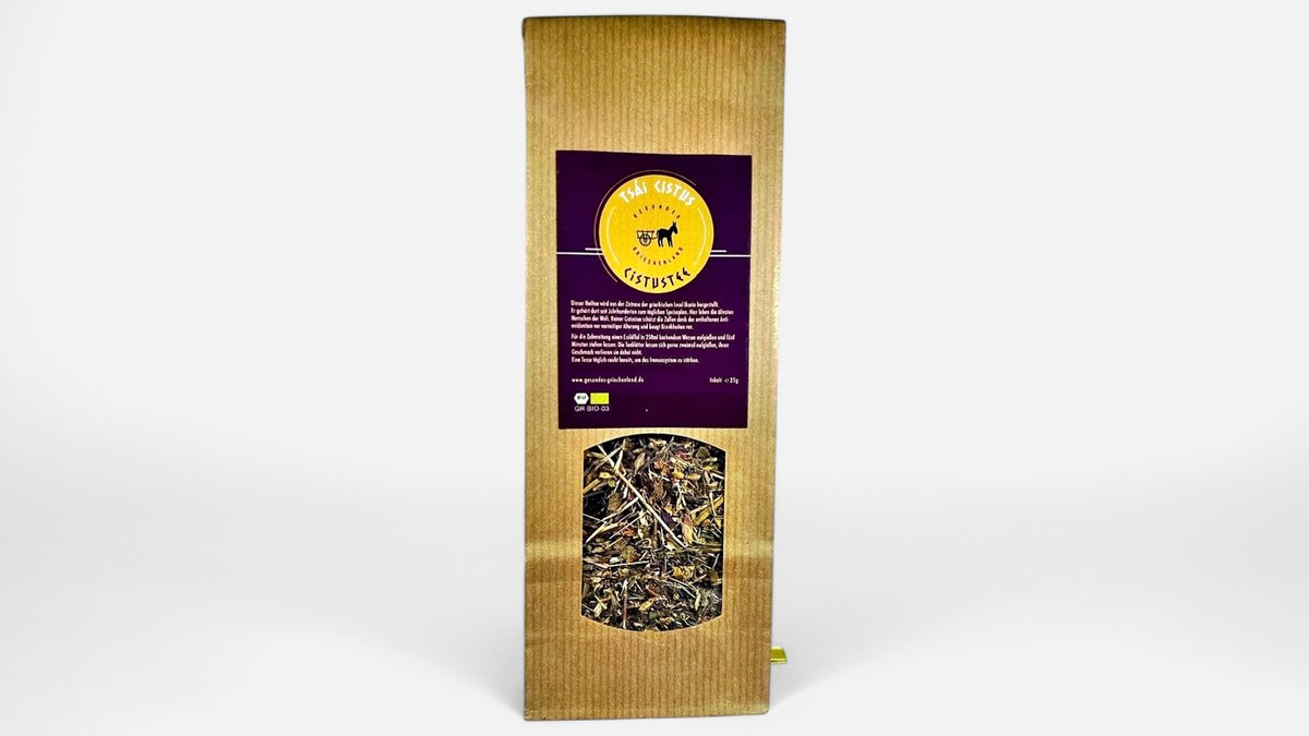 Ingredients: 100% Cistus Cistus, or Rock Rose, is a true miracle of nature. It was highly sought after in ancient times in southern countries. Later, shepherds prepared an aromatic tea from it with relaxing and mood-lifting properties. Our Cistus herbal tea is made from the Rock Rose from the Greek island of Ikaria, where it is traditionally hand-harvested and sun-dried. It is still part of the daily diet on the island, home to the world’s oldest people. Preparation: Pour one tablespoon of tea into 250 ml of hot, but not boiling water, and let it steep for five minutes. For external use, such as a compress or mouthwash, pour two tablespoons of Cistus tea into 0.5 liters of cold water, bring it to a boil, then simmer gently for 10 minutes. Pure Cistus has a strong effect, so do not drink more than 2 cups per day. Effect: Pure Cistus tea strengthens the immune system. It protects cells from premature aging thanks to the antioxidants it contains and helps prevent illness. The polyphenols in Cistus prevent uncontrolled viral reproduction, helping infections to be contained more quickly. It can bind and eliminate heavy metals from the body. Cistus has anti-inflammatory effects, both internally (e.g., for intestinal infections or vomiting diarrhea) and externally (e.g., for neurodermatitis, eczema, acne, itching). It is also used as a mouthwash for painful blisters in the mouth and as a sitz bath for hemorrhoids.
