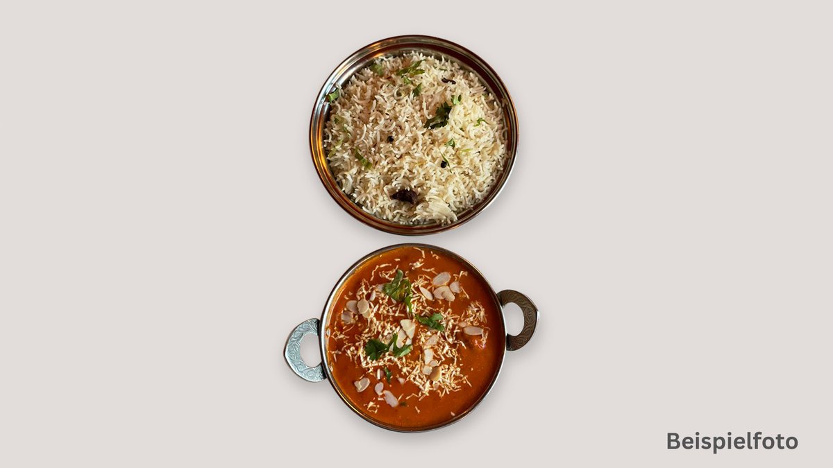 indischer Rahmkäse in Mangosoße mit Reis oder Pommes